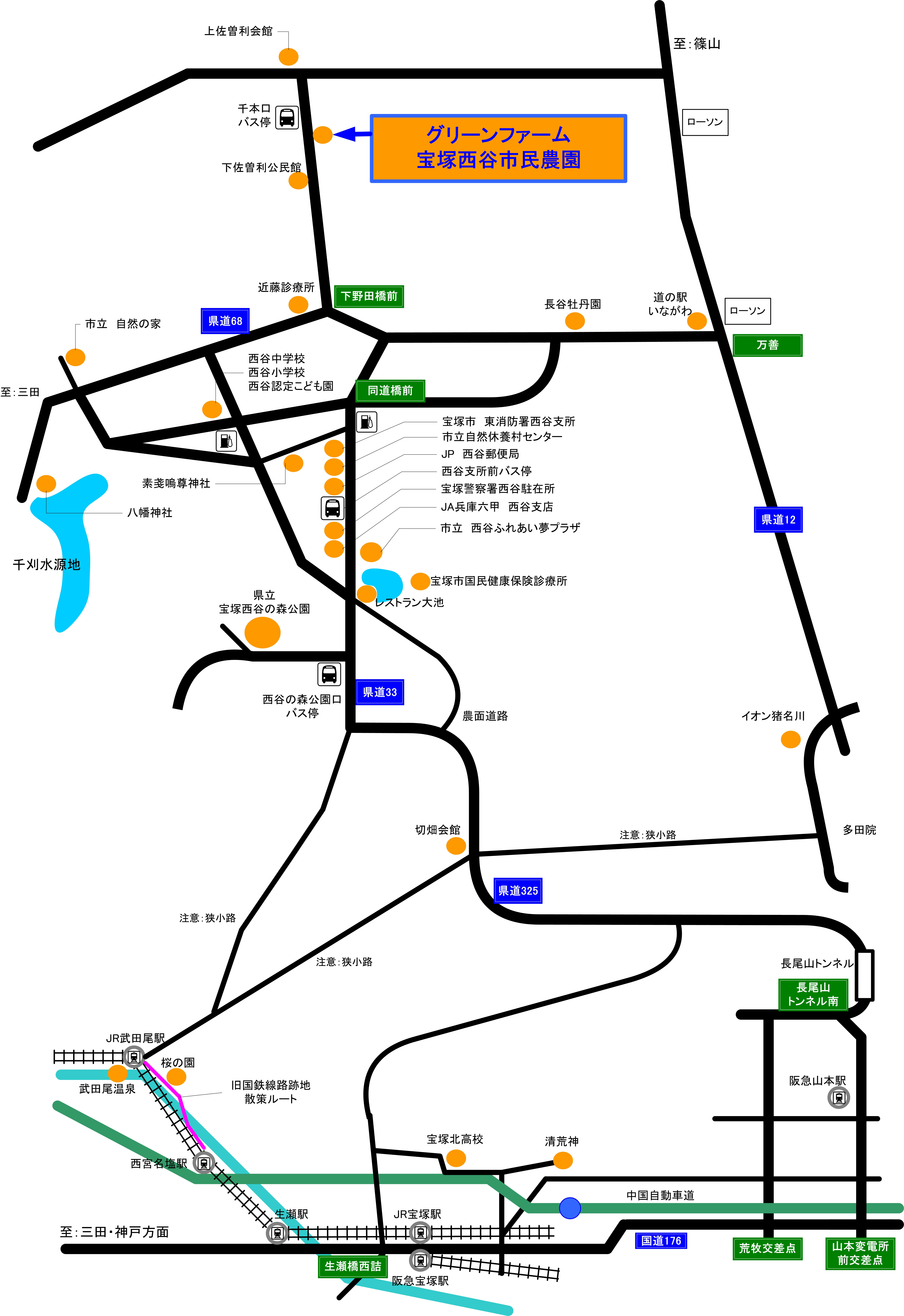 電車・バス:JR福知山線(宝塚線) 武田尾駅下車、阪急田園バス上佐曽利行きバス 千本口バス停下車徒歩3分